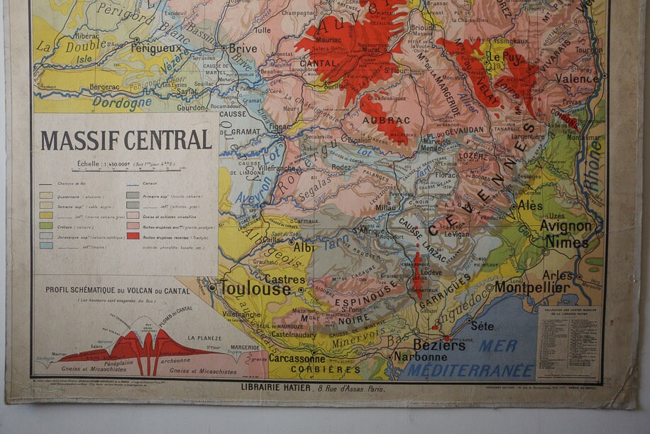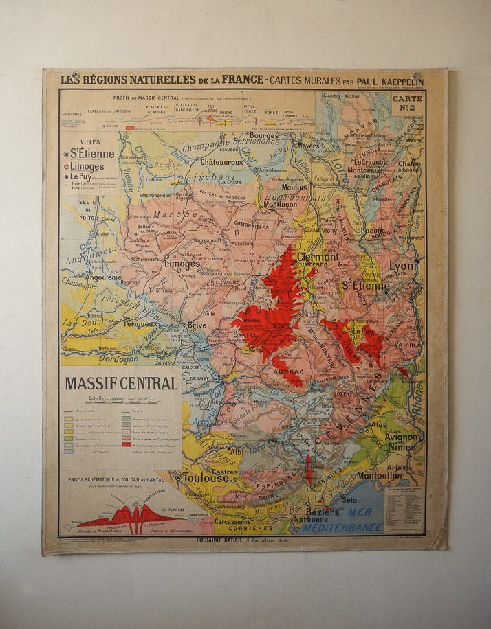 Gorgeous colour palette in this large and very cool original French wall chart map of the Massif Central area of France by Paul Kaeppelin.