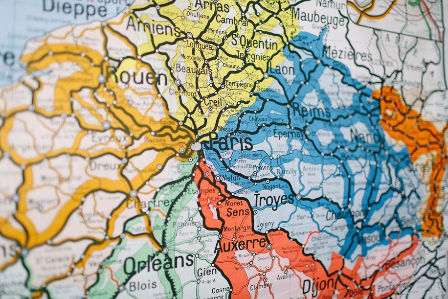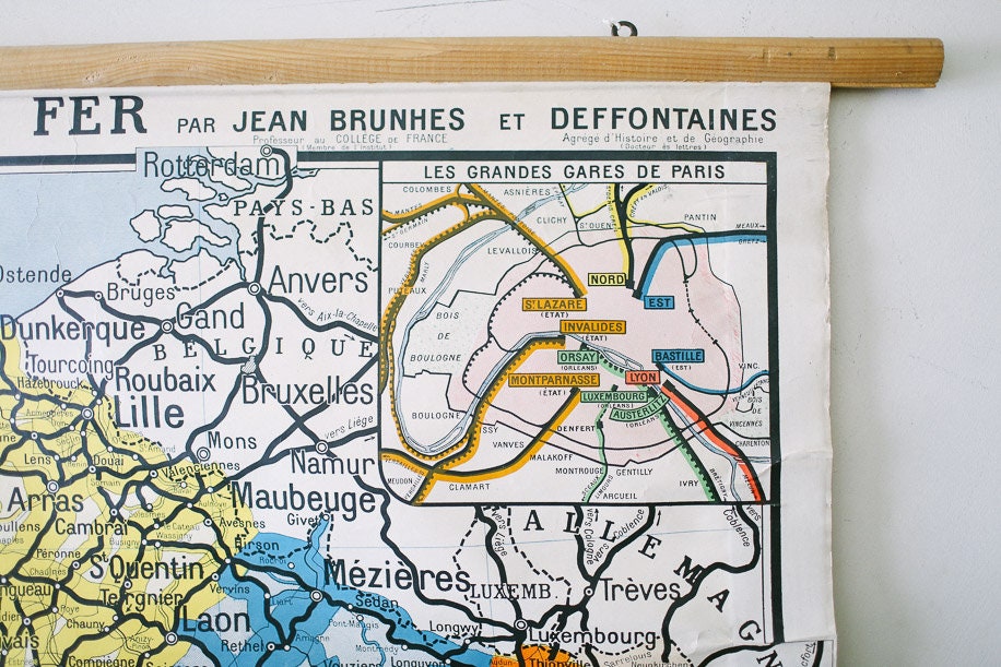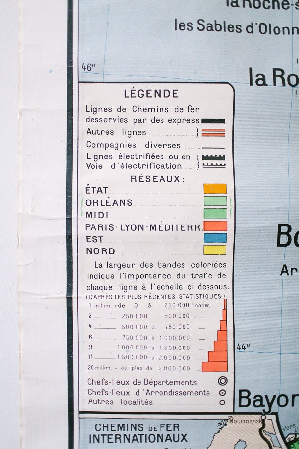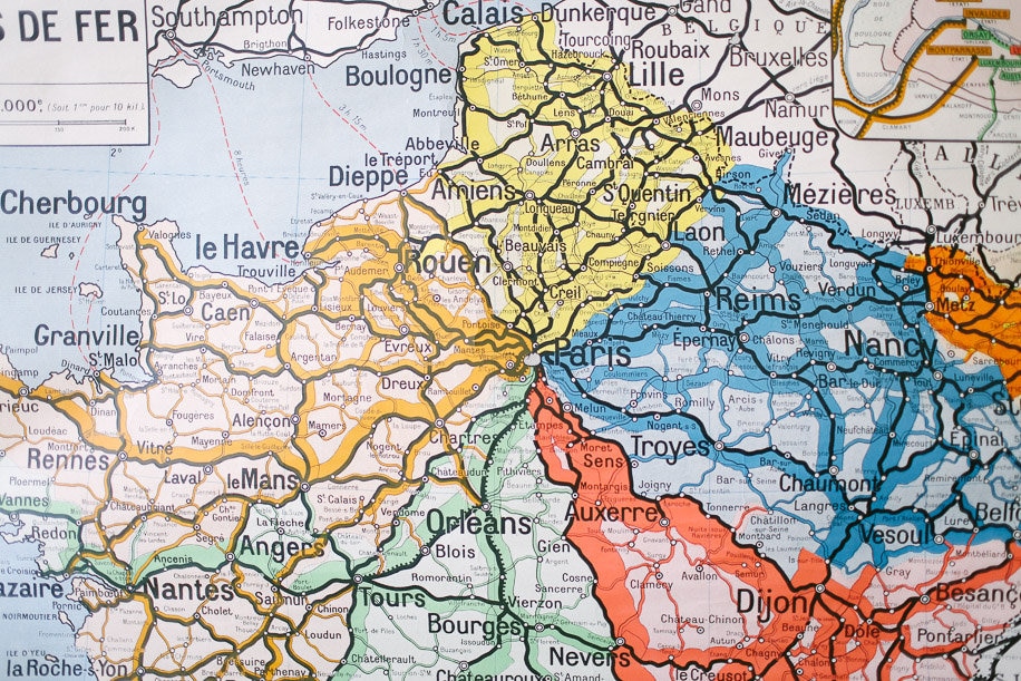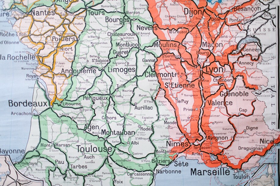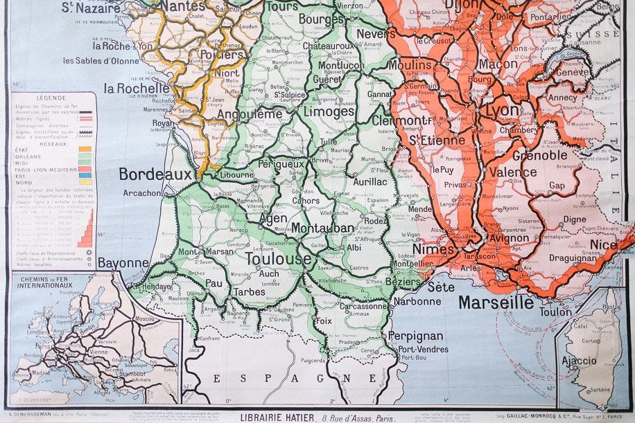 Gorgeous colour palette in this large and very cool original French wall chart map of the France's Rail Network by Bruhnes.