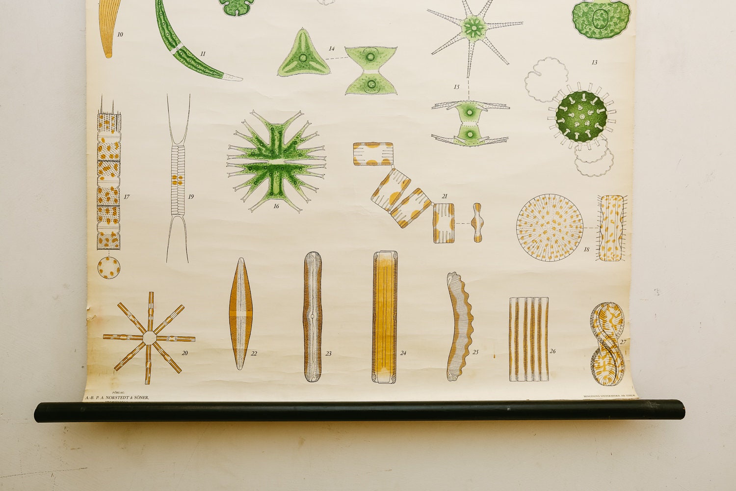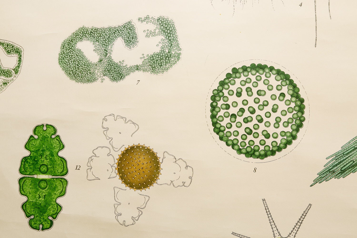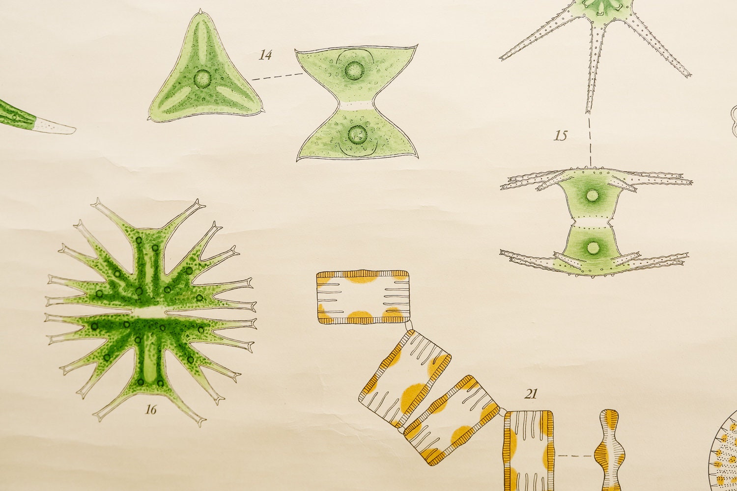 A break from the traditional botanical chart, this original chart is a study of microscopic single cell algae.