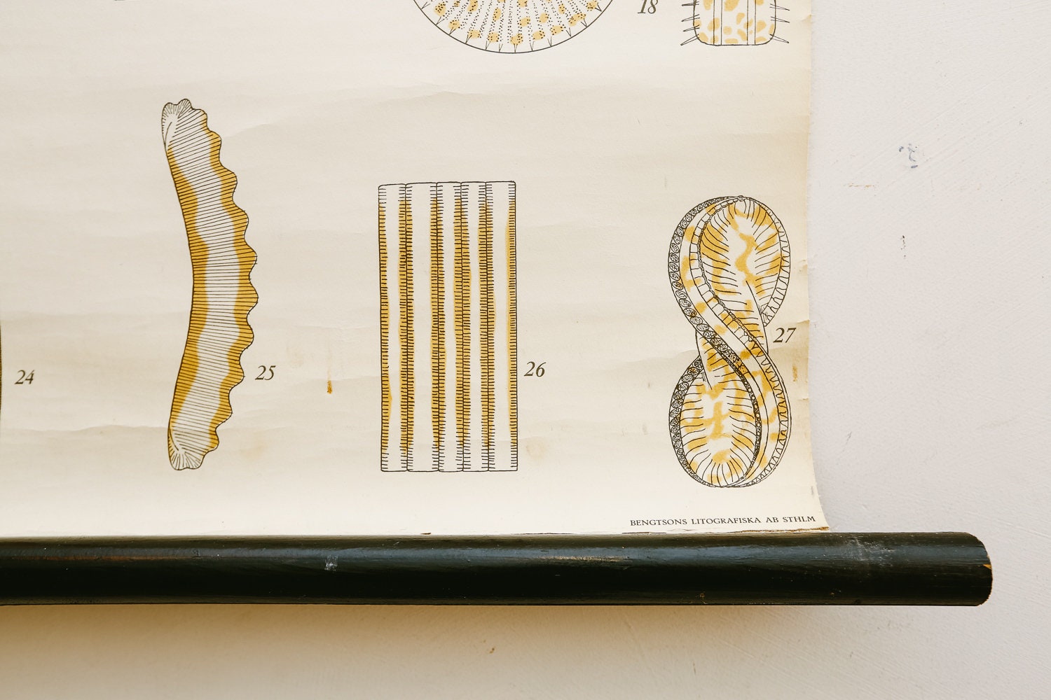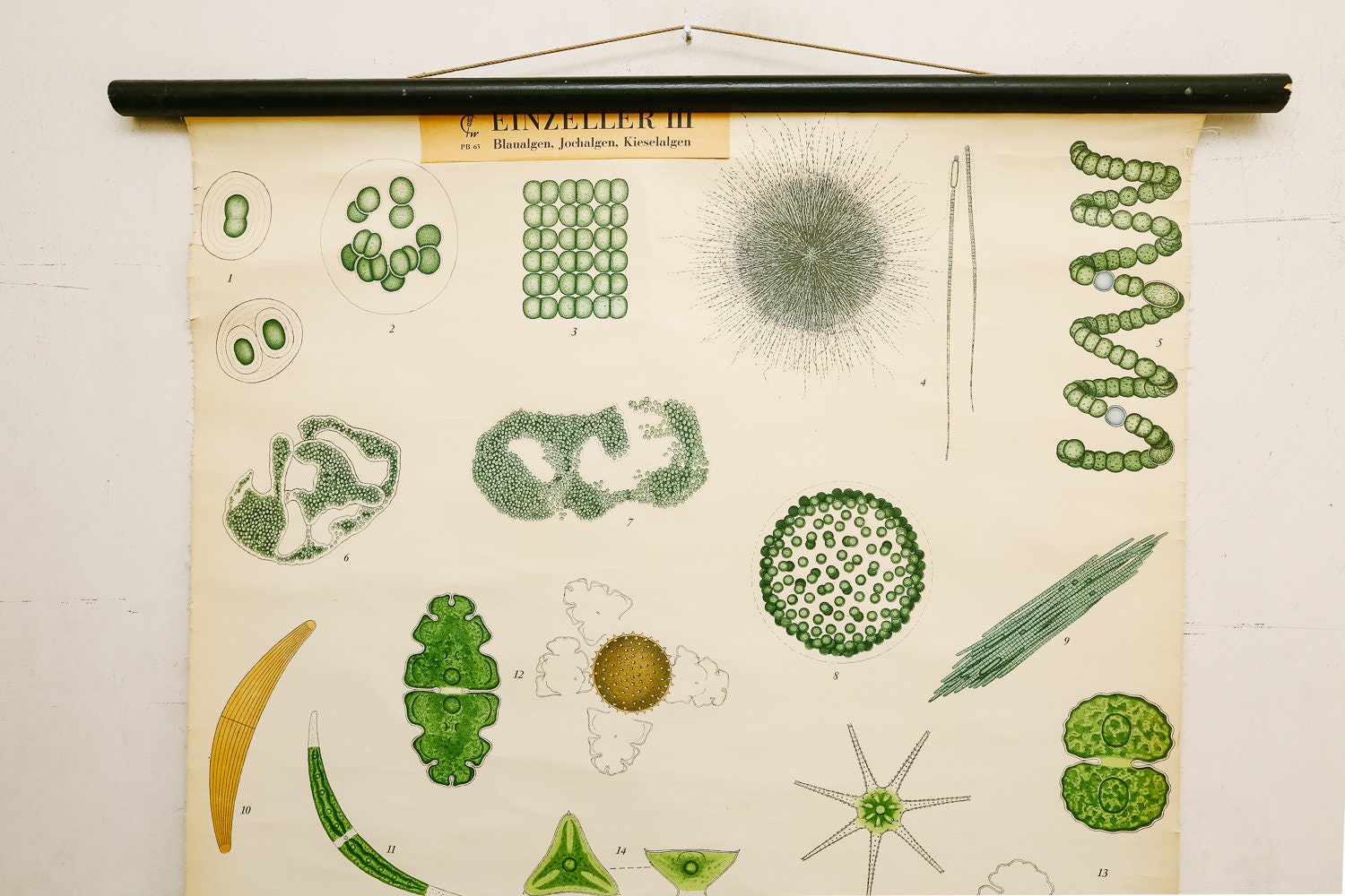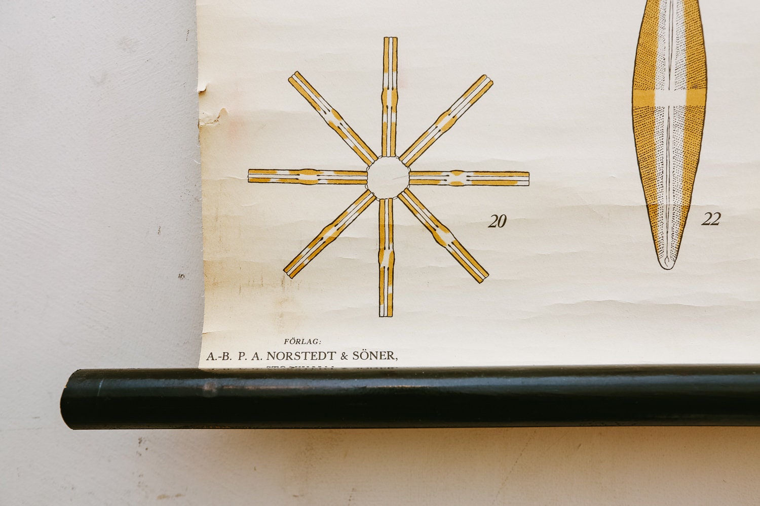 A break from the traditional botanical chart, this original chart is a study of microscopic single cell algae.